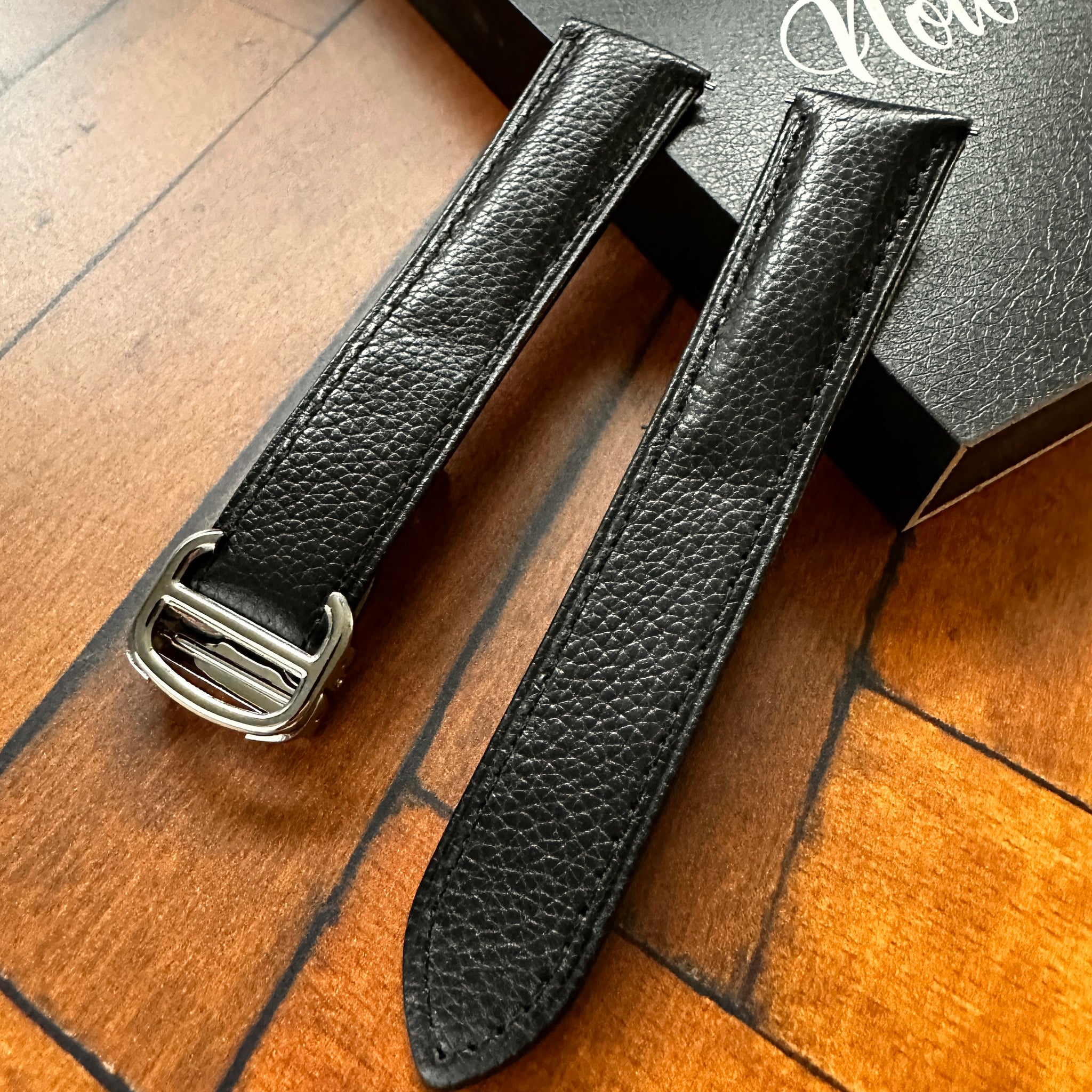 Designed to fit Cartier Tank models, the strap combines classic aesthetics with modern comfort. The sleek black top grain leather is paired ewith a soft inner lining for improved comfort and durability, making it a perfect choice for everyday wear.